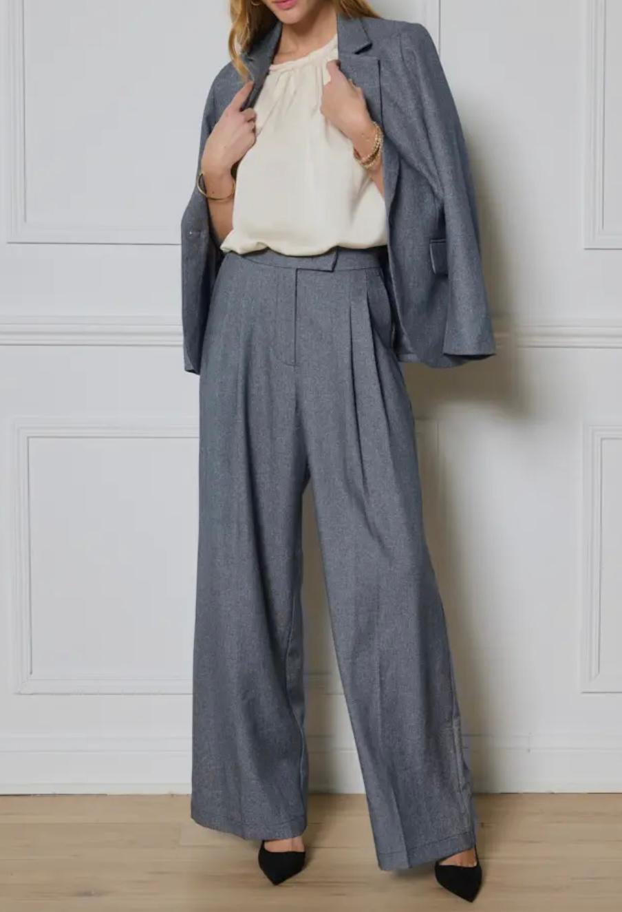 Pantalón modelo Wide Leg en color gris azulón, tiro alto. Ideal para combinar con nuestra blusa de satén en color marfil y nuestra Blazer recta en color azulón. Las tres piezas se venden por separado.